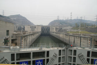 Lors du dîner, nous arrivons à l'écluse qui va nous permettre en traversant 5 bassins de descendre au niveau aval du Yang-Tsé (nous perdons 25 mètres par bassin, le premier et le second sont actuellement au même niveau. Nous assistons au passage du second bassin et de la descente de 25 mètres avant d'assister à un nouveau petit spectacle, cette fois assuré par des professionnels.